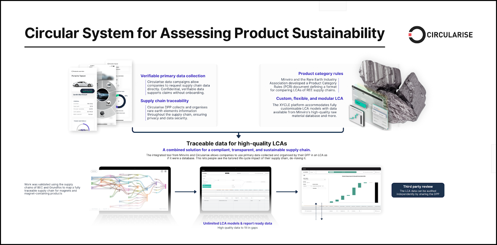 Circularise and Minviro developed a system for that opportunity in the CSyARES Project. The two platforms work together to connect verified supplier data through Circularise’s blockchain platform and quantify environmental impacts via Minviro’s LCA models. This directly responds to these needs by creating a transparent, auditable record of how critical materials are sourced and processed. It is designed as a single, cohesive system that replaces fragmentation with flow. By transforming raw data into auditable insight through a streamlined, four-stage process, it is a bridge between policy objectives with industrial realities.