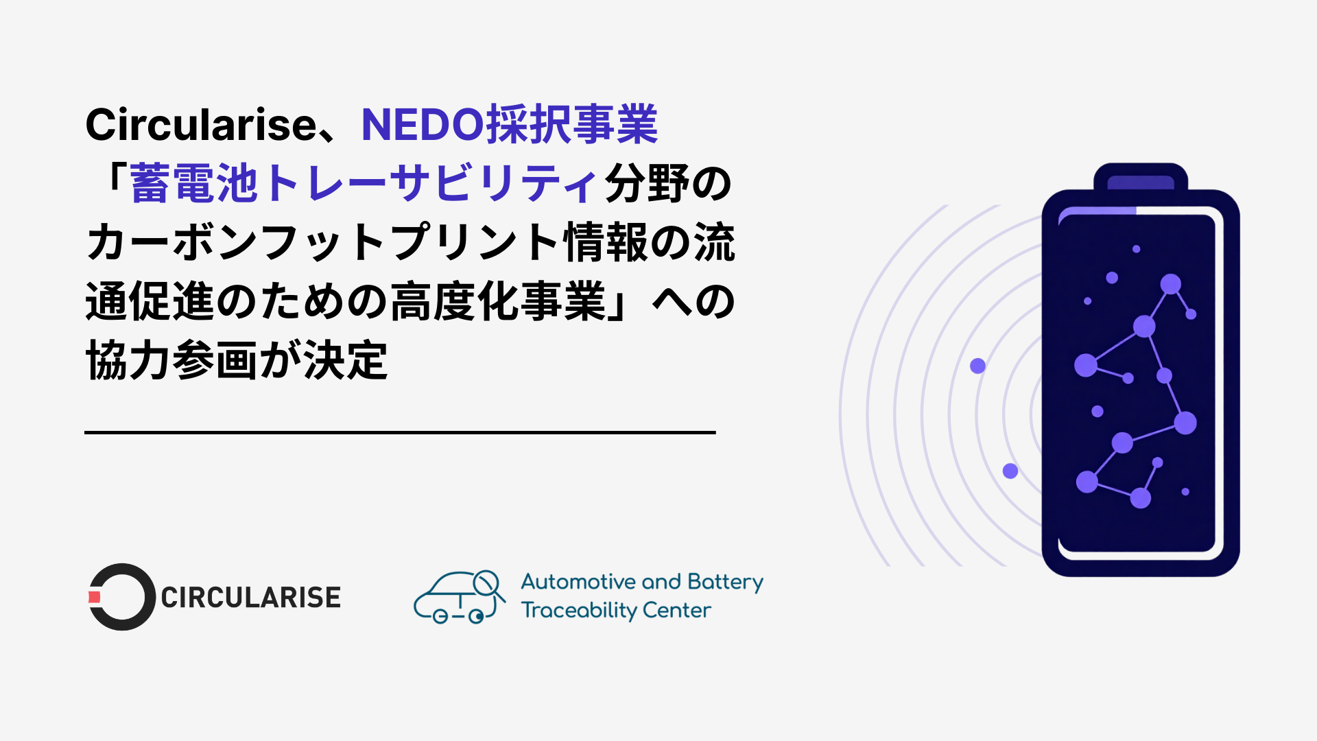 サプライチェーンのトレーサビリティを実現するソフトウェアを開発・提供するCircularise(サーキュライズ、本社:オランダ、以下「Circularise」)は、一般社団法人自動車・蓄電池トレーサビリティ推進センター(以下「ABtC」)が推進する、国立研究開発法人新エネルギー・産業技術総合開発機構(NEDO)採択事業「蓄電池トレーサビリティ分野のカーボンフットプリント(CFP)情報の流通促進のための高度化事業」(以下「本事業」)に、協力事業者として参画することが正式に決定したことをお知らせします。